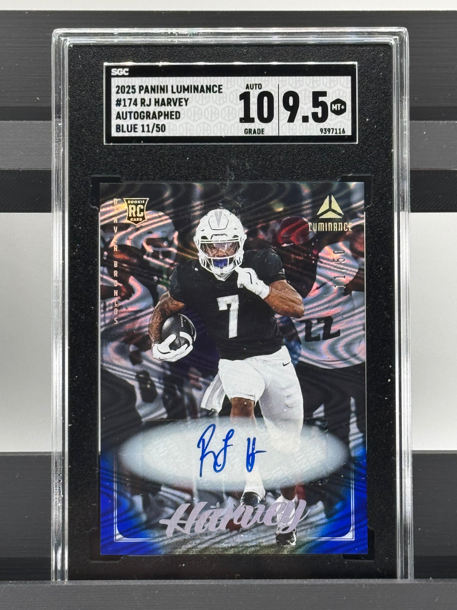 2025 Panini Luminance #174 Rj Harvey Auto Blue RC 11/50 SGC 9.5 Auto 10 Denver Broncos